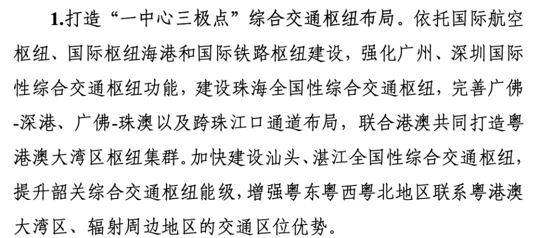 所谓“一中心”,便是广州-深圳国际综合交通枢纽。所谓“三极点”,便是建设珠海、汕头、湛江三个全国性综合交通枢纽。