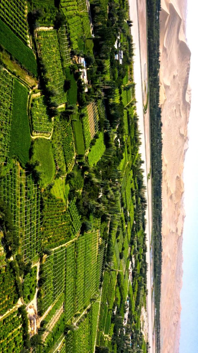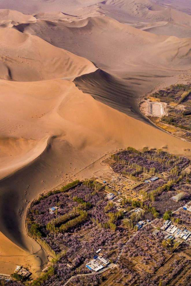 敦煌鸣沙山下,杏树延伸出一片绿洲。
