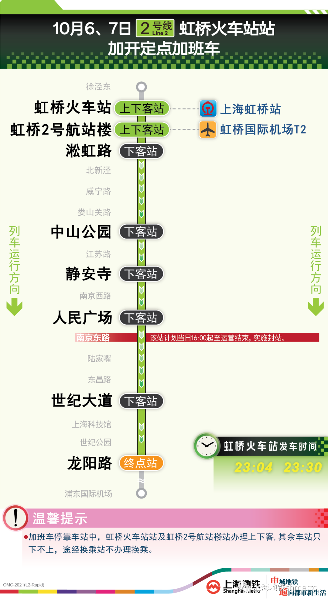 其中,1号线上海南站站往富锦路站方向定点加班车沿途仅停靠徐家汇站、人民广场站、上海火车站站、上海马戏城站、通河新村站、富锦路站,其余车站跳停。停靠车站中,上海南站站、上海火车站站可上下客,其余车站只下不上,途经换乘站不可换乘。