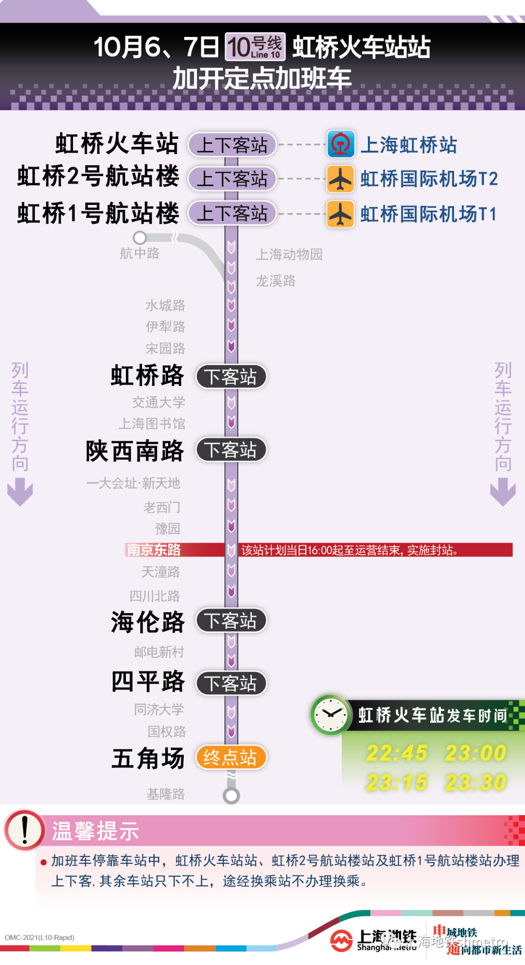 10号线虹桥火车站站往五角场站方向定点加班车,沿途仅停靠虹桥火车站站、虹桥2号航站楼站、虹桥1号航站楼站、虹桥路站、陕西南路站、海伦路站、四平路站、五角场站,其余车站跳停。停靠车站中,虹桥火车站站、虹桥2号航站楼站、虹桥1号航站楼站可上下客,其余车站只下不上,途经换乘站不可换乘。