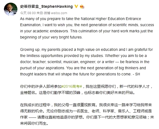 今晨,英国剑桥大学著名物理学家史蒂芬•霍金教授在其官方认证的微博上发文,鼓励2016高考生,并称“未来将因你们而生”。
