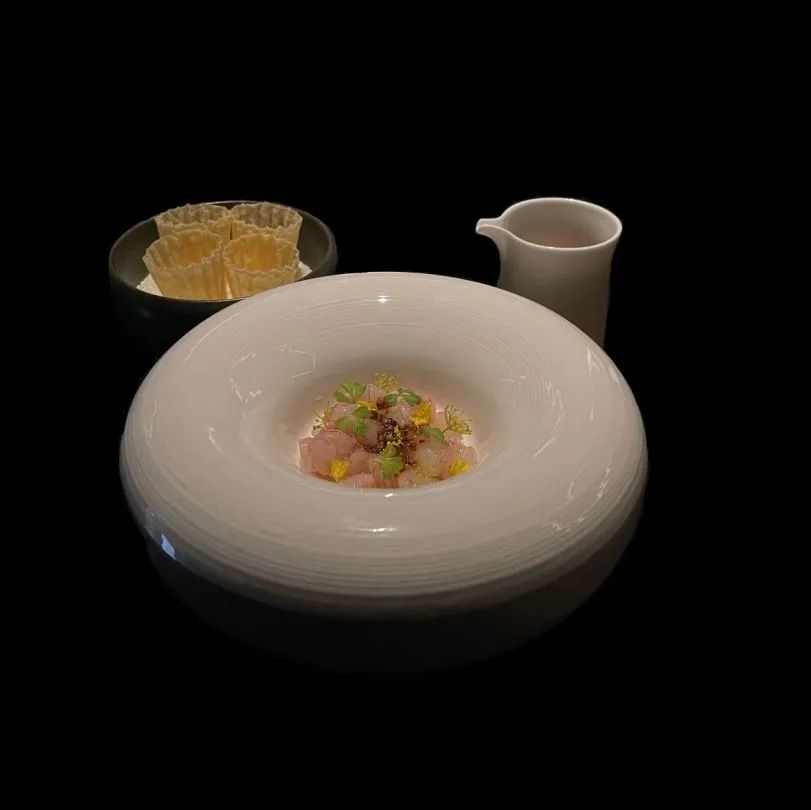 黑白灰色调的西式餐厅,门头隐蔽,入口处设有星空顶,令人有如坠梦境之感。餐食上用料十分考究,致力于呈现恰到好处的口感。餐厅侍酒师是拿过奖的郭莹,在业界广受赞誉,其设计的酒单是这里的重头戏,时常令人惊喜。特色美食
