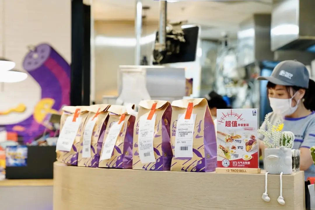 TACOBELL的早餐时间段:7:00-10:00。小虹看到,店内的收银台边上摆放着5、6份已经打包好的早餐,正等着顾客“上门自取”。