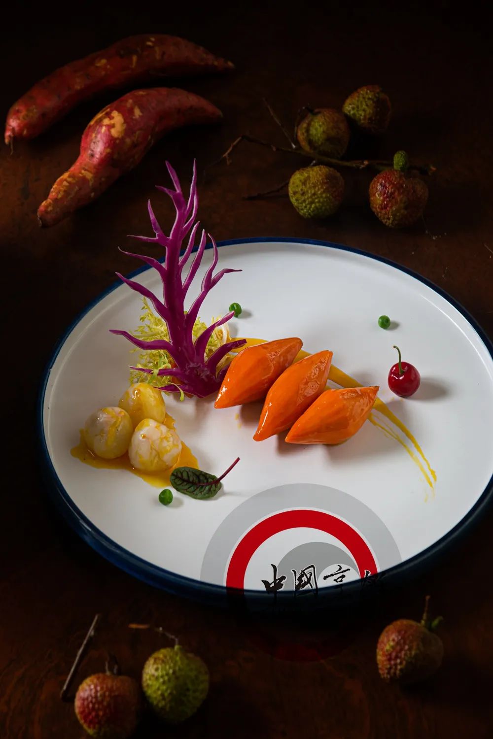 将红薯去皮洗净,削成橄榄状,加去核的荔枝肉、红枣、枸杞、清酒、少许清水、麦芽糖、盐、白糖煮至红薯软糯、汤浓稠,出锅,放入已装饰好的盘中做造型即可。