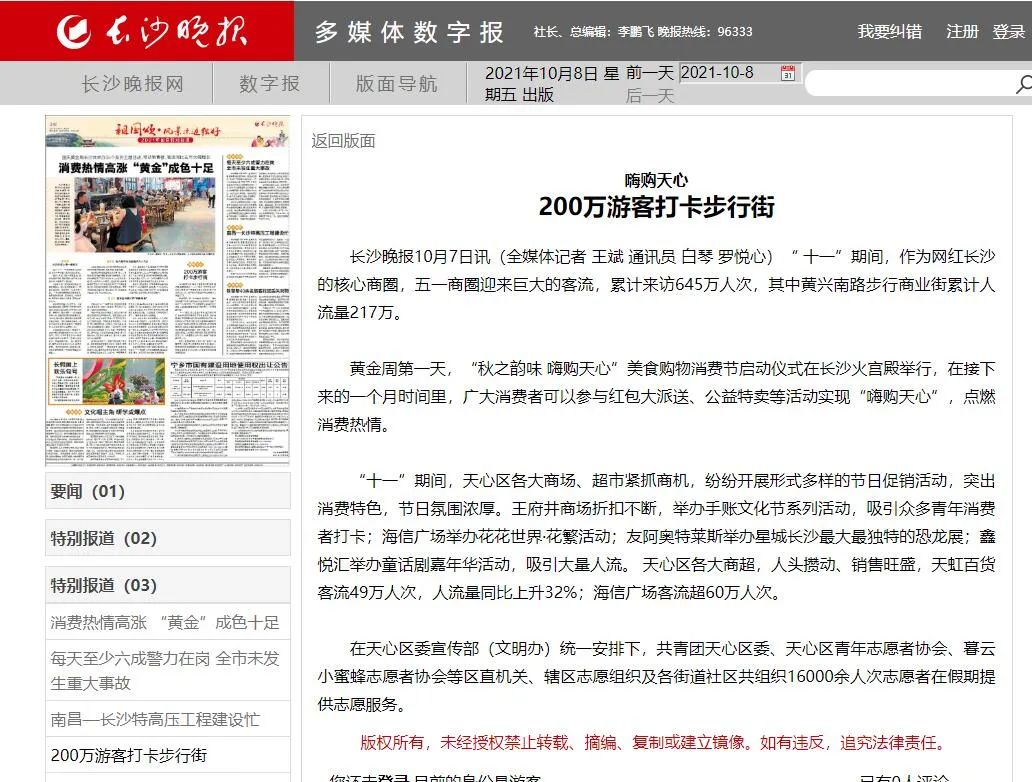 《长沙晚报》→《嗨购天心:200万游客打卡步行街》