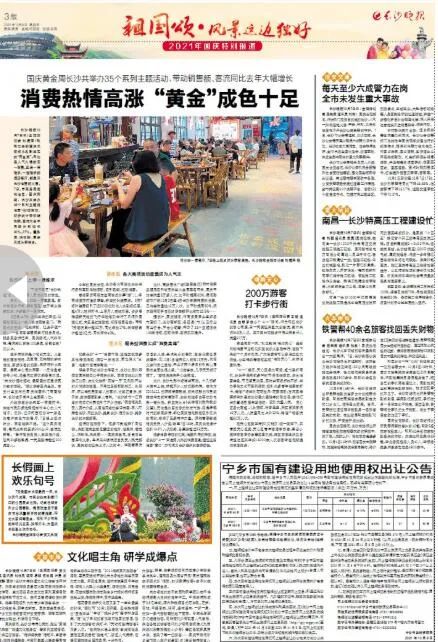 《长沙晚报》→《消费热情高涨 “黄金”成色十足》10月8日,长沙晚报报道五一商圈稳坐长沙人气王,解放路坡子街餐饮店迎来客流高峰。