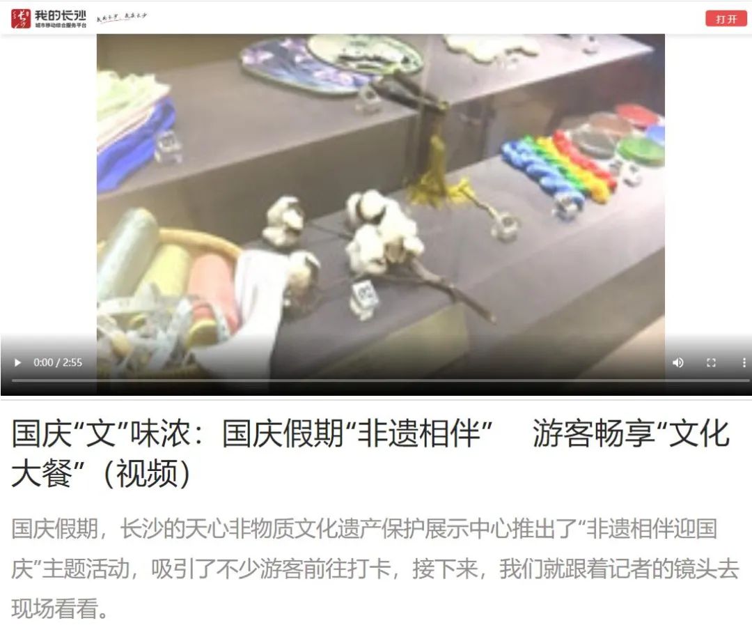长沙政法频道→《国庆“文”味浓:国庆假期“非遗相伴” 游客畅享“文化大餐”》10月4日,长沙政法频道报道天心非物质文化遗产保护展示中心推出了“非遗相伴迎国庆”主题活动,吸引了不少游客前往打卡。