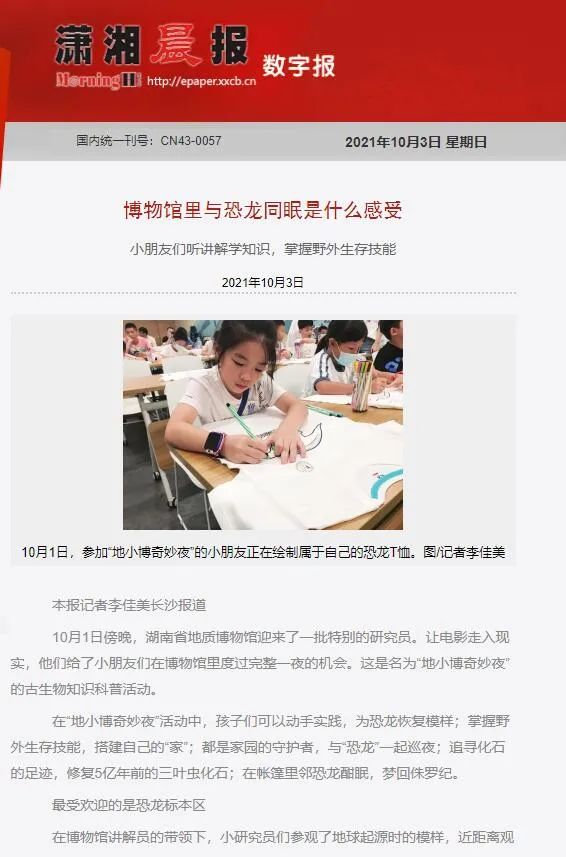 《潇湘晨报》→《博物馆里与恐龙同眠是什么感受》10月3日,潇湘晨报报道国庆期间,地质博物馆内科普活动妙趣横生、寓教于乐,吸引了许多小朋友们开心打卡。