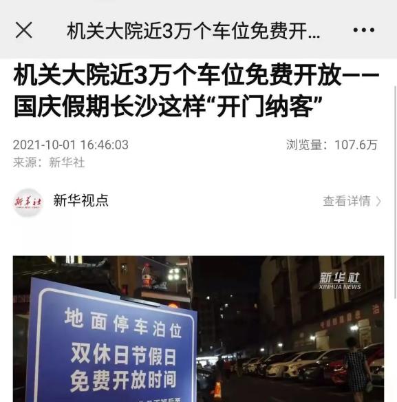 长假——城市服务不断档新华社→《机关大院近3万个车位免费开放——国庆假期长沙这样“开门纳客”》