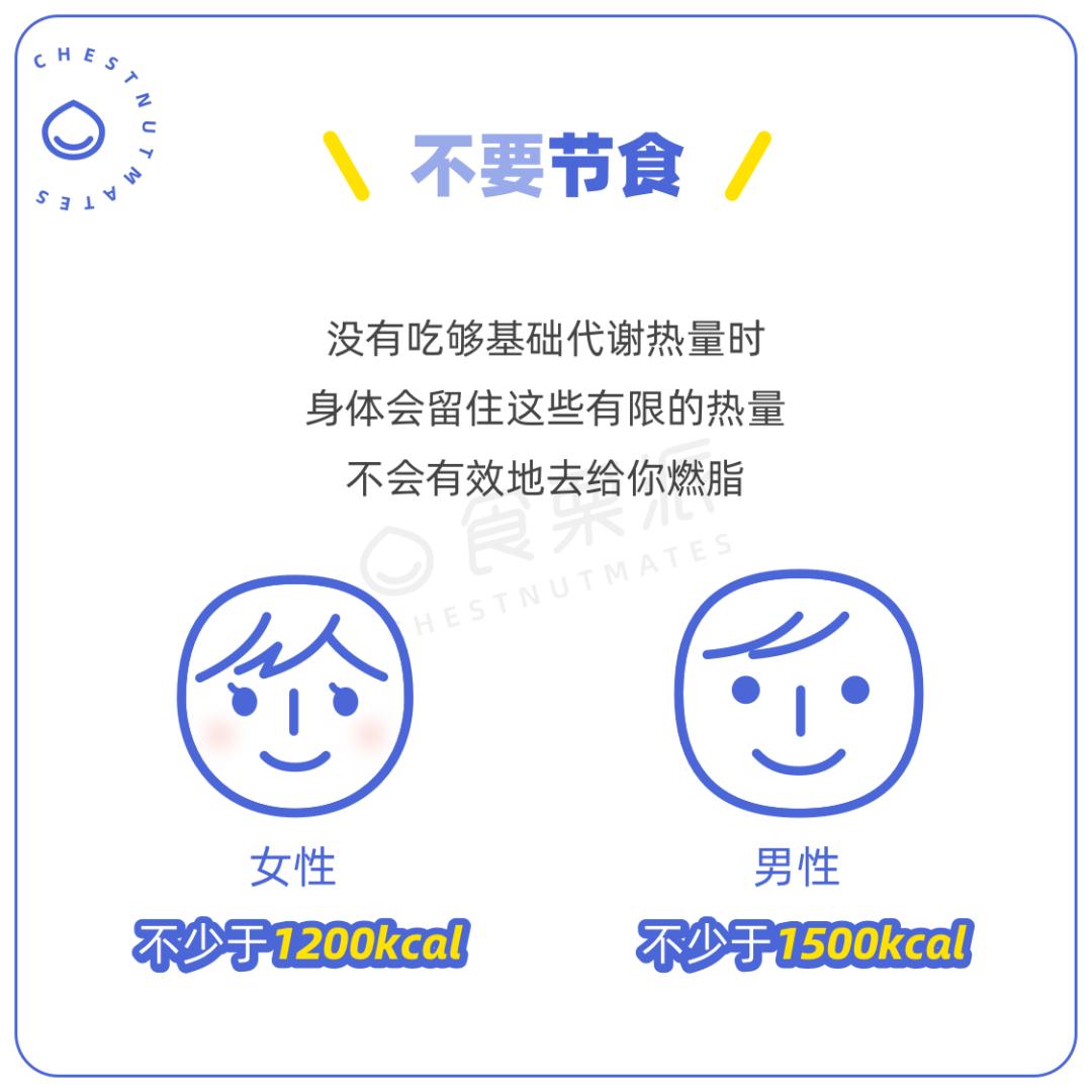 没有吃够基础代谢热量时,身体会留住这些有限的热量,不会有效地去给你燃脂。节食可能会帮助你刚开始掉一些体重,但你也会流失肌肉,很快遇到减脂平台期,一旦恢复正常饮食,身体会让你更容易囤积肥肉,反倒养成“易胖体质”。