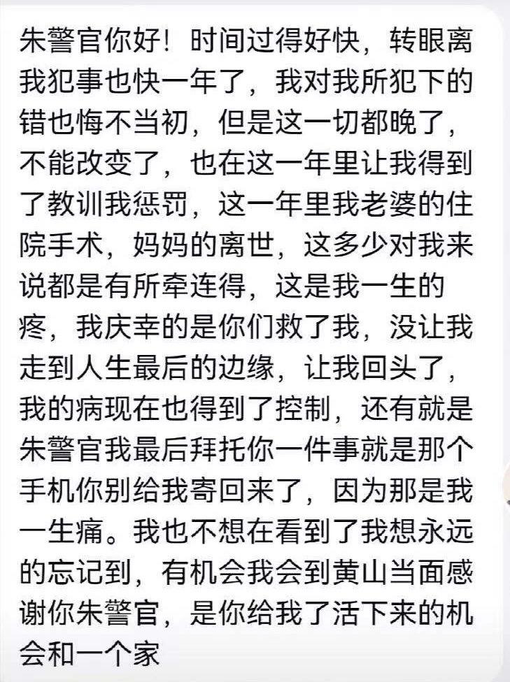 “朱警官你好!时间过得好快,转眼离我犯事也快一年了,我我所犯下的错也悔不当初,但是这一切都晚了,不能改变了,也在这一年里让我得到了教训和惩罚。这一年里我老婆的住院手术、妈妈的离世,这多少对我来说都是有所牵连的,这是我一生的疼,我庆幸的是你们救了我,没让我走到人生最后的边缘,让我回头了,我的病现在也得到了控制。还有就是朱警官,我最后拜托你一件事,就是那个手机你别给我寄回来了,因为那是我一生痛。我也不想再看到了,我想永远的忘记,有机会我会到黄山当面感谢你。朱警官,是你给我了活下来的机会和一个家。”短信是一名曾经的吸毒人员夏某某发来的, 虽然短信的文笔中错别字不少,但表达的意思明确。作为一名缉毒警察,收到这样一封特别的感谢信,朱警官由衷地为夏某某感到高兴。