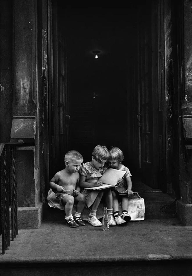 在厄威特拍摄纽约的几十年间,中间也曾有过一个松散的摄影团体,包括罗伯特·弗兰克、海伦·莱维特等人。他们组成一个姑且叫作“纽约派”的松散摄影师组织。亚当·戈普尼克认为“纽约派”的所有成员都创造了出色的作品:“他们有些像14 世纪的佛罗伦萨画派,你需要花点工夫才能找到一张坏作品。合适的手法、自然的或看上去自然的黑白快照、如此完美地遇到合适的创作对象、战后的城市生活……而相比于罗伯特·弗兰克、海伦·莱维特的一丝略难察觉的忧郁,厄威特则像是卓别林式的街头闲逛者,在城市中寻觅‘警句和机智的幽默’,并且他找到了。”