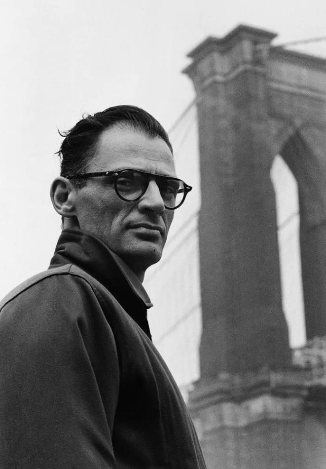 剧作家亚瑟·米勒,美国纽约布鲁克林,1954年《纽约客》的专栏作家亚当·戈普尼克(Adam Gopnik)曾就这张照片与卡蒂埃·布列松拍摄的冬日里巴黎艺术桥一端的让-保罗·萨特(Jean-Paul Sartre)的照片进行过对比,“从米勒的肖像中我们可以感受到,将作家带过这座‘从布鲁克林通向百老汇’的桥梁(就像人们形容严肃作家和流行作家时经常用的陈词滥调)的那份桀骜不驯,桥本身很长,但在照片中被压缩了。厄威特的米勒完全是被独立创造出来的,卡蒂埃-布列松的萨特则是共同谋划的结果:桥很小,在它的一端会面感觉神神秘秘的,更远处的法兰西学会的圆顶则象征法国文化的延续性。一张是关于近在咫尺的成功,另一张则是关于固有的焦虑。”