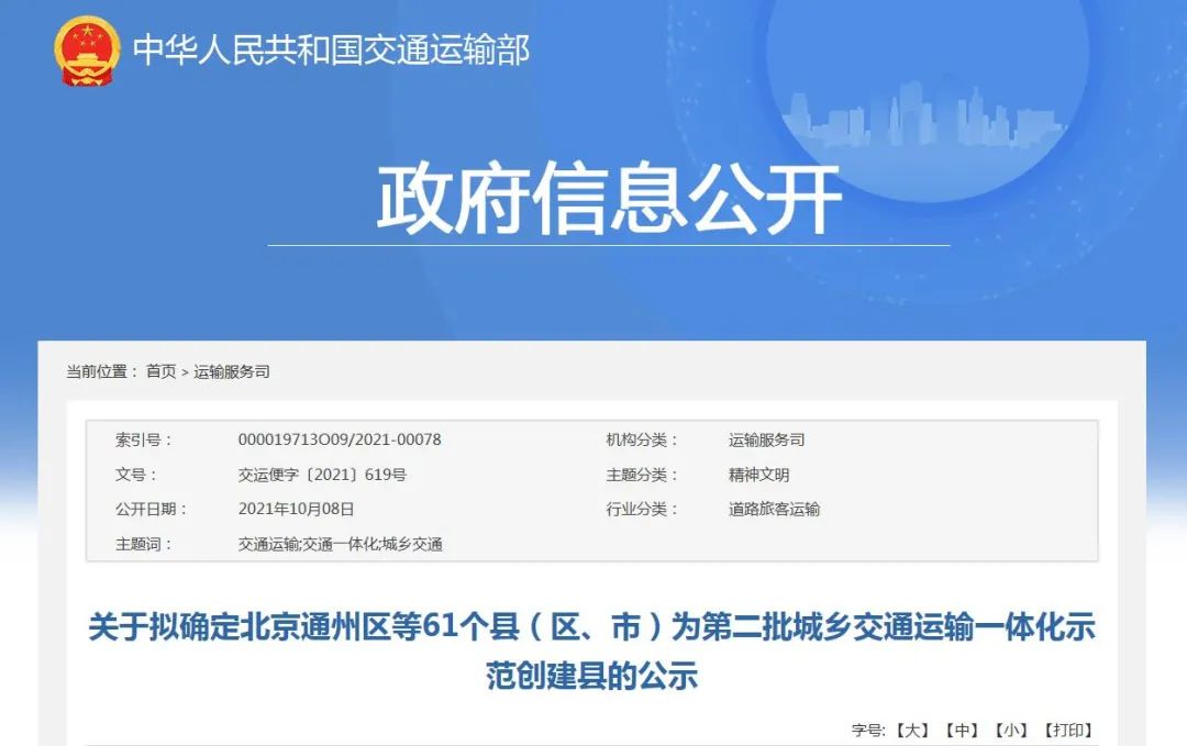 经综合评议,北京市通州区等61个县(区、市)符合创建要求,拟作出上述县(区、市)为第二批城乡交通运输一体化示范创建县的决定。现予以公示,公示期限为2021年10月8日至10月14日。如对公示内容有异议,请在公示期限内向我们反映。