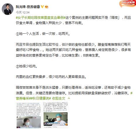 报道中血常规和叶酸、维生素B12检查结果可以比较明确的指向巨幼红细胞性贫血,而非缺铁导致的缺铁性贫血。科信食品与营养信息交流中心科学技术部主任阮光锋发微博认为,报道案例的主要问题其实不是“隔夜”,而是饮食太单调,食物摄入种类太少,营养不均衡。阮光锋分析视频中说胡女士“一个人生活,做一次饭,吃两天”,生活较为节俭,也很少吃肉。“膳食指南推荐我们每天最好吃12种食物,她这两天都只吃几种食物,营养摄入肯定就是很少,很多有益铁吸收的营养素肯定也不够,比如维生素C,B族维生素”。其次,肉里的血红素铁最多,很少吃肉的人更容易贫血。