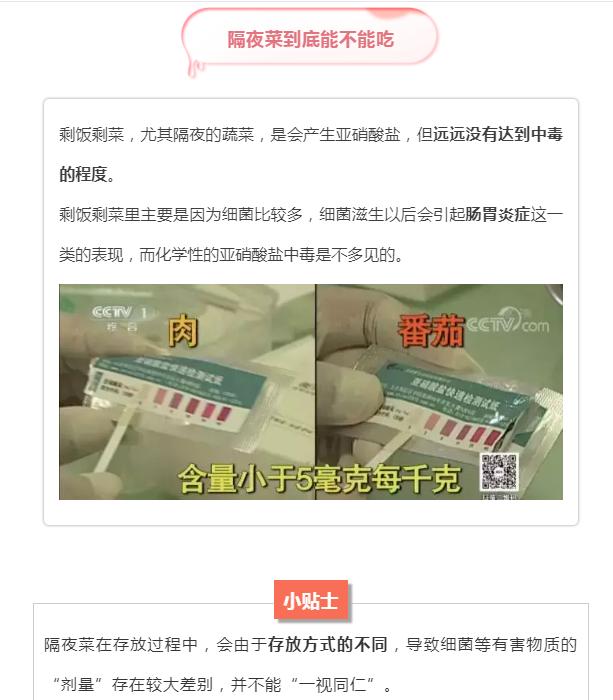 隔夜菜中亚硝酸盐含量是否变高早已有很多权威科普。首先,隔夜菜并不单指放了一夜的菜,如果放置时间超过8-10个小时,就算“隔夜”;其次如果处理得当,快速库冷藏,隔夜菜的风险是可以忽略的。