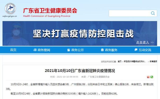 10月9日0-24时,全省新增境外输入无症状感染者3例,广州报告2例,分别来自日本和土耳其;佛山报告1例,来自荷兰。新增出院3例。