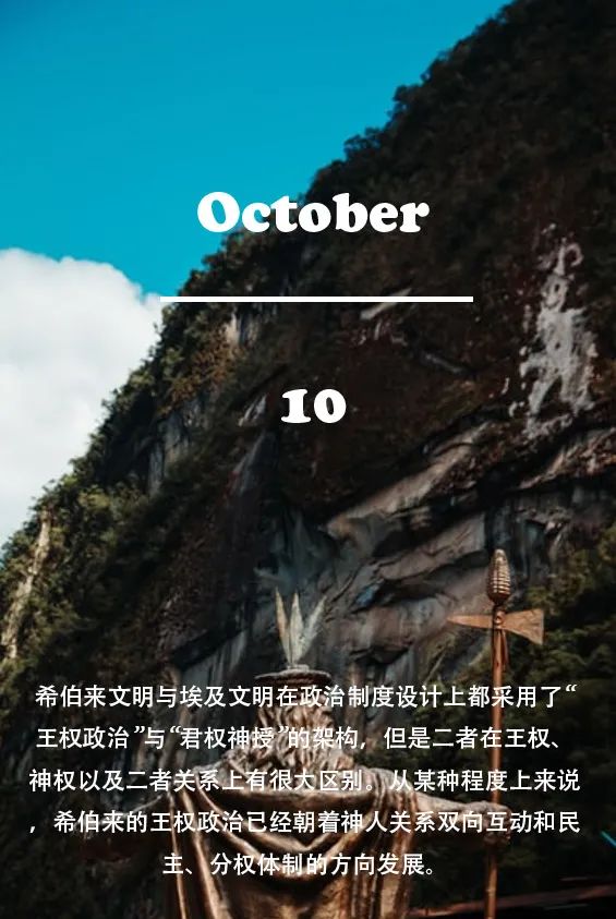 再看看希伯来宗教的神灵是如何安排的。按照希伯来圣经《塔纳赫》,世界也是神灵创造的。希伯来人的上帝(也有翻译成“神”,本名“雅赫维”)用手在混沌中划出一道闪电,分出天和地,创造出最初的空间。在神创的这个世界上,上帝创造出世间万物,包括山川河流、虫鱼鸟兽。在第六天也就是最后一天,上帝才创造出人类。在创造出人类之后,上帝就休息了,不再进行创造活动。(创世记:第1~2章)人虽然是上帝最后创造出来的,但由于上帝是按照自己的形象创造的人,所以上帝就把管理与治理世界的权力赋予整个人类,而不是像古埃及那样只授予了法老。这样的设计意义十分重大,即人人都有参与治理和管理世界的权力,也可以理解为人人都具有参政、议政的权力和能力。这种权力分配设计不仅扩大了人类管理世界的授权范围,而且其中孕育着人人平等的民主理念。这是希伯来宗教在理论架构和制度设计方面比古埃及进步的地方。