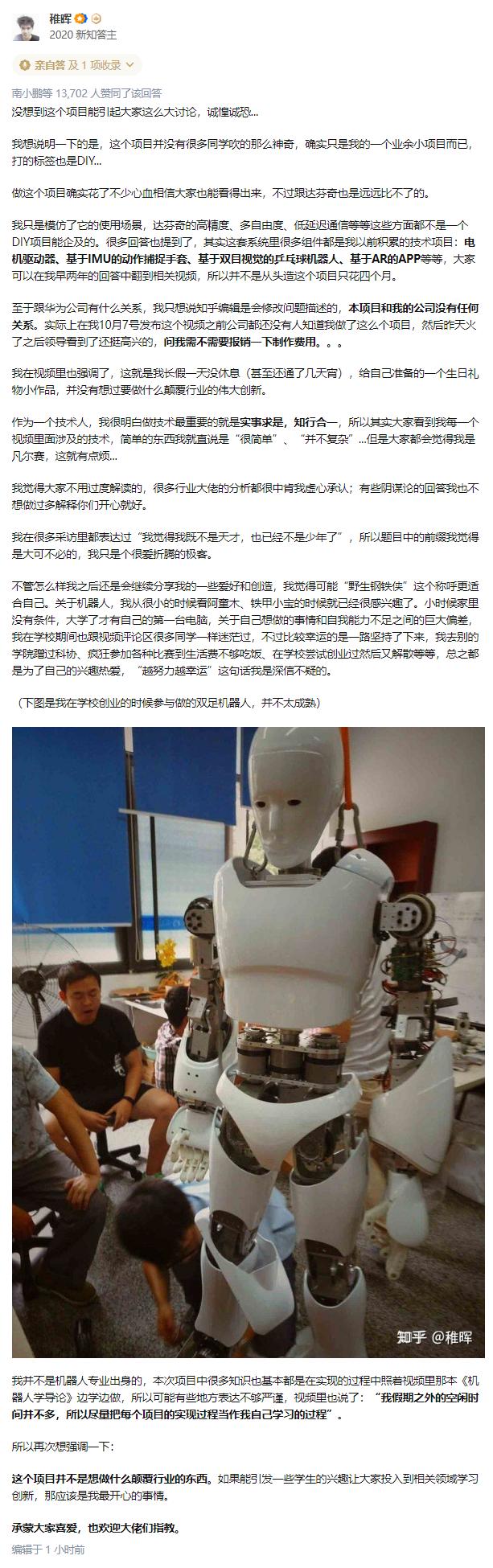 在视频走红后,稚晖君本人也进行了回应。他在回应中提到,这个项目和华为没有任何关系,但“领导看到还挺高兴的,还问需不需要报销一下制作费用”。