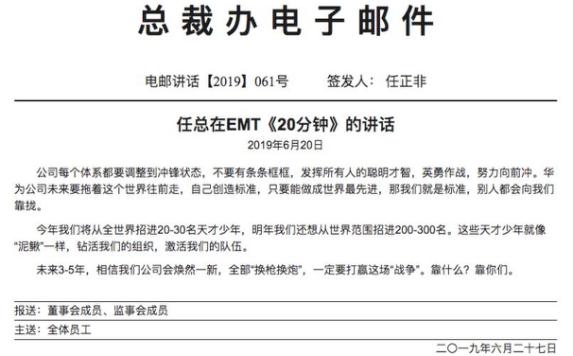 2019年6月,华为EMT(经营管理团队)内部讲话中披露:任正非表示,“今年(2019年)我们将从全世界招20-30名天才少年,明年(2020年)我们还想从世界范围招进200-300名。这些天才少年就像‘泥鳅’一样,钻活我们的组织,激活我们的队伍。”