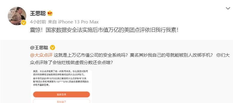 从王思聪发布的截图中可以看到,系统提示:由于你在2021年10月9日通过美团将大众点评账号“王思聪”绑定的手机号更新为:137****2797,因此你需要使用新手机号重新登录。在动态发布没过多久,王思聪转发上述动态,并配文称:“震惊!国家数据安全法实施后市值万亿的美团点评依旧我行我素!”