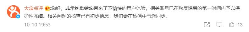 10日晚间,大众点评回应,非常抱歉给王思聪带来了不愉快的用户体验,相关账号已在王思聪反馈后的第一时间内予以保护性冻结。相关问题的核查已有初步信息,我们会在私信中与您同步。