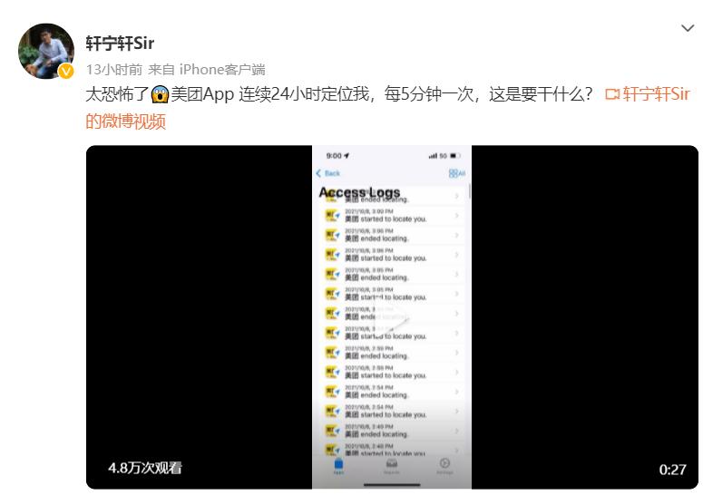 10月10日一大早,有数码博主@轩宁轩sir在社交平台爆料称,“太恐怖了,美团App连续24小时定位我,每5分钟一次,这是要干什么?”