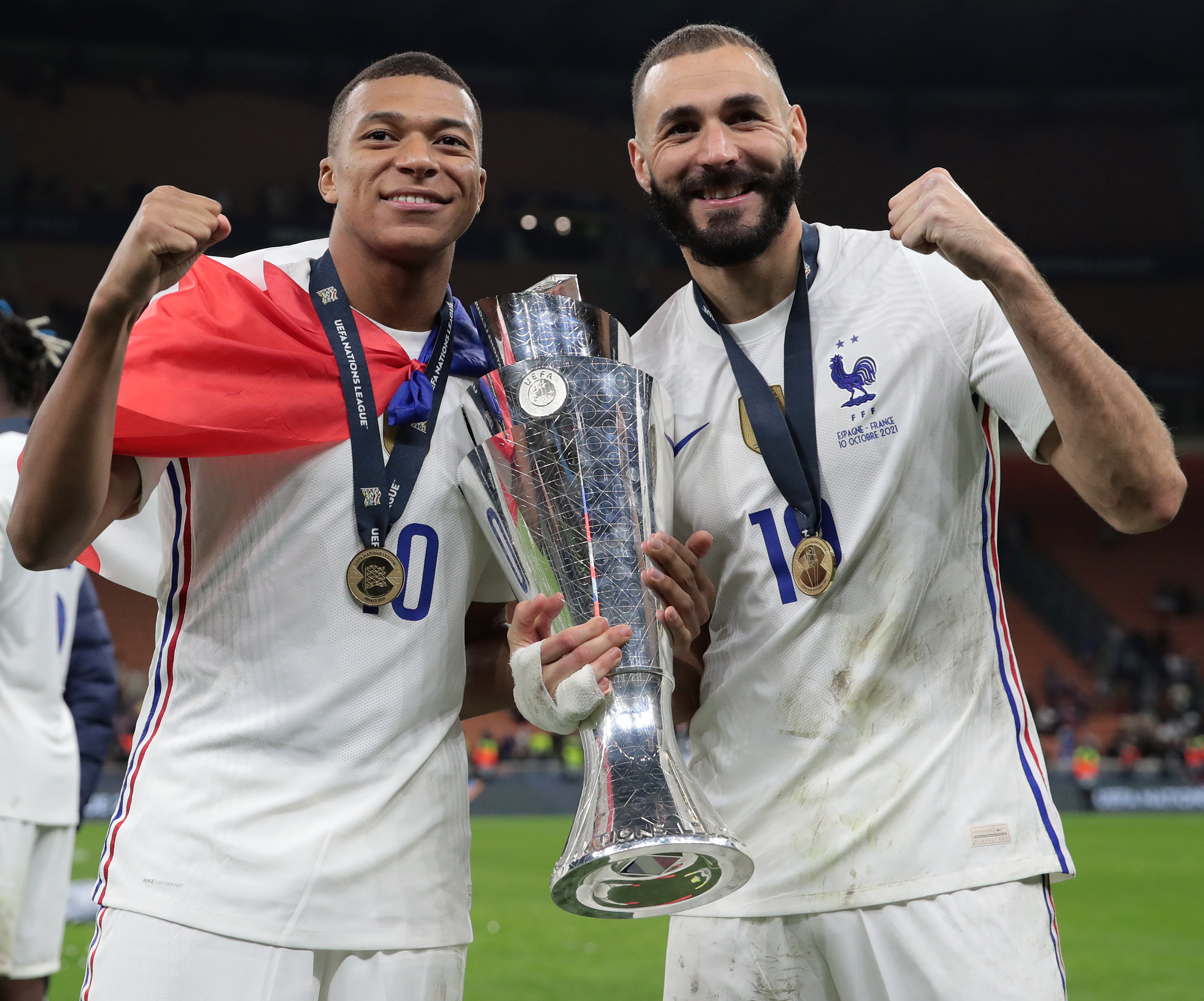 本泽马紧抱欧国联冠军奖杯。
