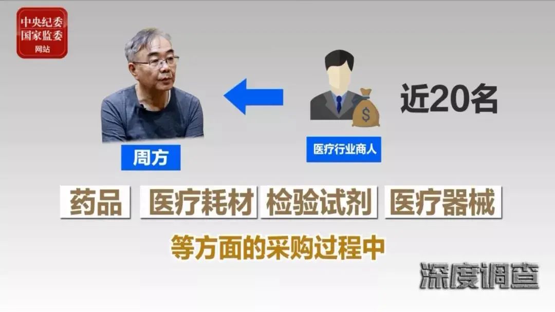 审查调查发现,周方收受近20名医疗行业商人财物,主要违纪违法行为发生在药品、医疗耗材、检验试剂及医疗器械等采购过程中。