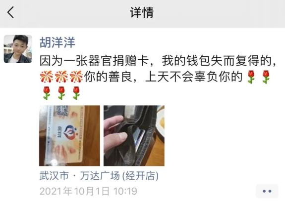 9月30日晚21点,来自湖北省武汉市的高女士拨打了400-010-6695器官捐献咨询热线,负责当晚咨询热线值班的北京市红十字会紧急救援中心(999)值班员在了解到高女士捡到一个钱包,想通过钱包里的“中国人体器官捐献志愿登记卡”联系失主归还钱包的情况后,立即向中国人体器官捐献管理中心工作人员进行了报告。考虑到失主丢失钱包一定很着急,中心工作人员接到信息后第一时间通过志愿登记系统查询到了失主胡洋洋先生的联系方式,并与他取得了联系,告知有人捡到了他的钱包欲归还。之后又迅速联系了来电的好心人高女士,告知失主胡先生将与她联系,并对她的善举表达了感谢同时送上了国庆祝福。胡先生和高女士取得了联系后,到达了相约的地点。高女士将钱包完好无损的交还于失主,胡洋洋先生对好心的高女士表达一番感激,并在朋友圈写下了这么一段话:你的善良,上天不会辜负你。这句话是对自己小小善举的一种激励,他相信善良终究会用不同方式给人回馈。