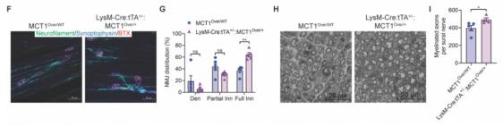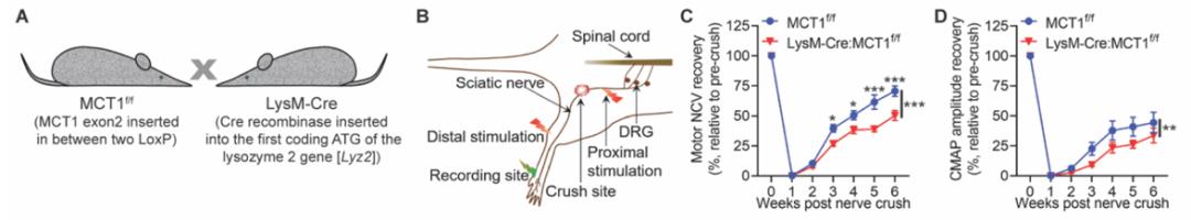 研究团队先前证明了MCT1全身敲除的转基因小鼠在神经损伤后无法神经再生。为了剖析MCT1在周围神经再生中的特殊作用,通过构建不同细胞类型的MCT1敲除小鼠,研究团队从巨噬细胞、神经周围细胞、施万细胞和DRG神经元选择性敲除了MCT1。他们发现巨噬细胞特异性敲除MCT1的基因小鼠,巨噬细胞降低了乳酸转运。于是,研究团队通过挤压小鼠的大腿近端坐骨神经来建立神经损伤模型,发现唯有巨噬细胞MCT1敲除小鼠的运动神经状态速度和复合肌肉动作电位都恢复的非常缓慢,腓肠肌中神经肌肉接头的分布以及有髓轴突的再生明显减少。以上结果表明,巨噬细胞MCT1在周围神经再生中起重要作用,其缺失会损害损伤后的周围神经恢复。