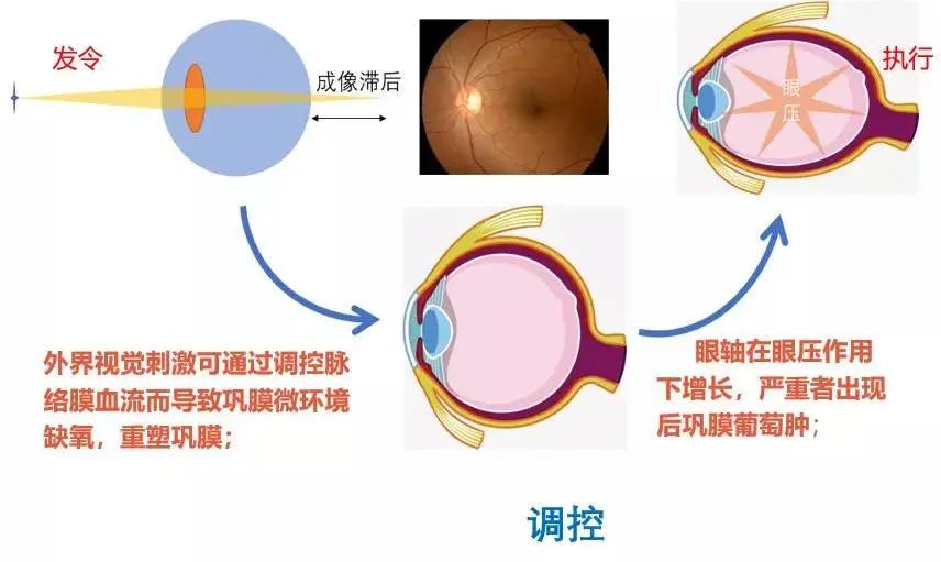 大家好,上一期说了成像滞后是近视发展的原因之一。它是一个启动因子,机体如果感受到成像点经常落在视网膜后面(对应的行为就是长时间的近距离用眼),就会启动眼轴增长的机制。具体的过程是,通过多巴胺的调控,脉络膜血流减少,使得巩膜缺氧重塑变薄,因为眼球内存在有11~21mmHg的正压力,在眼压的作用下,眼轴就被顶长了。这个过程就像吹气球,同样的压力下,气球壁越薄,气球就会被吹的越大。