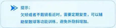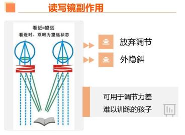 在正常情况下,看近的时候,眼睛会发生调节和集合反射,会拉近焦点然后内聚。近雾视疗法不让眼睛看近,调节力没有得到很好的训练,可能会减弱。但这种风险并不大,在近视防控和调节之间,控制眼轴始终是关键,调节力是可以通过训练得到恢复的。另一个潜在的风险,就是小部分孩子可能带来外隐斜的增加。在我们看近的时候,两眼内直肌额外发力,形成夹角,集合在近距离物体上。我们看远的时候两眼内直肌会放松,呈平行状态。如果眼睛长期不看近,调节和内聚的反射可能会紊乱,从而产生外隐斜的风险。但这个风险其实也不大,它可以通过每三个月测复查的时候,测眼位、视功能、AC/A值,以及它的集合能力来监测。一旦集合能力有下降的趋势,可以做一些像聚散球之类的训练来调节。而且如果发现外隐斜的度数增加了,可以停止使用读写镜或者不戴眼镜的方式。外隐斜也会逐渐纠正。所以针对近雾视疗法的副作用我们要有清晰的认识,定期做检查,发现问题及时调整。
