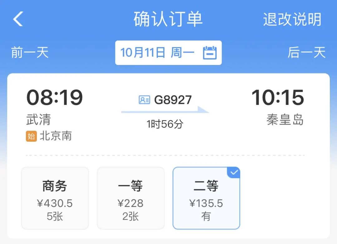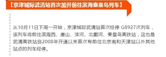10月11日起,北京南至秦皇岛的G8927次列车经停京津城际武清站。