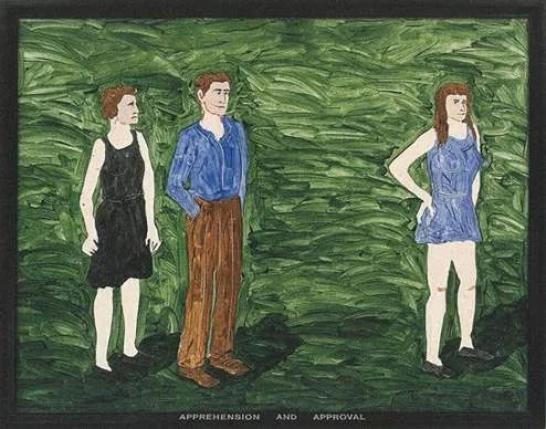 美国画家奈尔·詹尼(Neil Jenney,1945— )的《坏年代》(The Bad Years, 1969—1970),以粗陋的笔法和简单的色彩画出两个站着的男女,表情相当不快,也不存在什么造型。就这样,詹尼画了一系列的这样两个人站在好像草地的绿颜色上,笔触和颜色都不做更多的解释,既不写实,也不愉悦,简单而又粗暴。偶然有棕色和蓝色底子,好像就不会画除了绿底子之外的其他颜色。