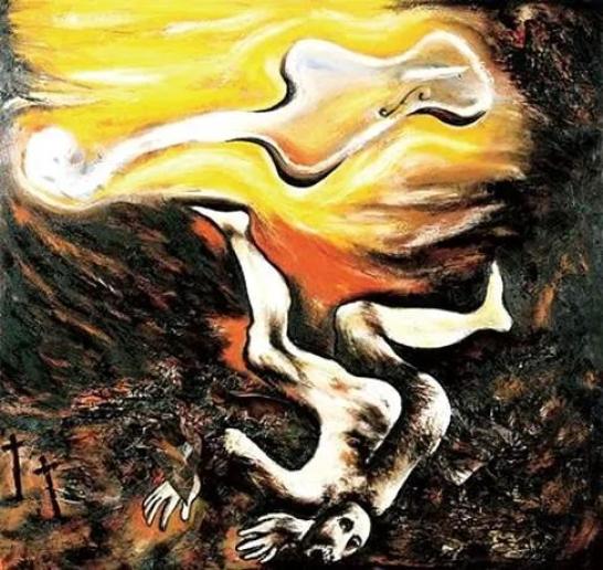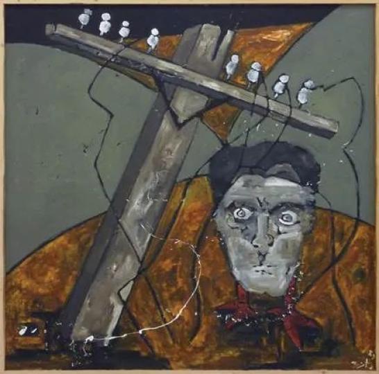 恩佐·库奇画作,《醉酒的音乐录》(Musica Ebbra),1982在库奇的作品中,宗教圣人和先知先民的形象被赋予了一种力度和狂暴的特征,呈现出一种原始主义的描述。库奇倾向于描绘地方传奇,他的个人神话充满了神秘和晦涩,要分辨出来是容易的,但是要判断这一类坏画粗野得好不好,还是挺难的事情。因为看画的人也要有一定的修养,缺乏对视觉语言的长期审美训练,就难以领略粗野中显现的优雅。
