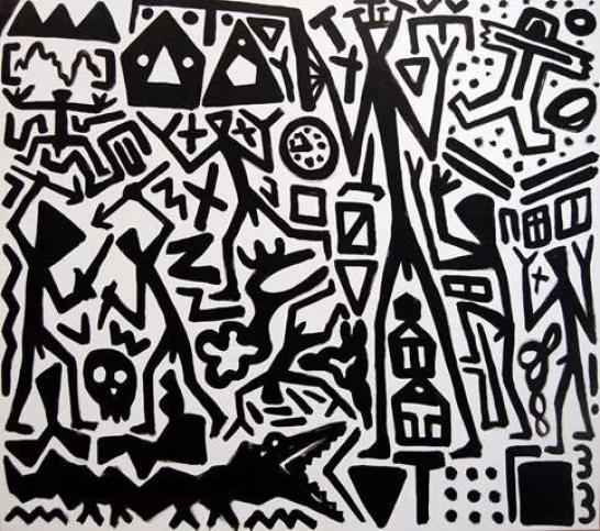 A·R·彭克画作,《系统绘画》(System Painting),2007在当代环境中回味洞穴文化以及古埃及、玛雅人和非洲土著的原生态艺术,也有一种基于本能的共鸣,这样的直率有着区域和历史的原因。以粗野和涂鸦对抗艺术,做高雅艺术的叛徒,彭克的勇气可嘉。我自己搞黑白版画,因此习惯于接受彭克那黑白分明的绘画。
