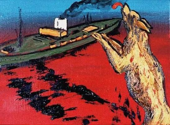 库奇不喜欢正儿八经地把画摆在画架上画,而是直接钉在墙上,或者要么在野外,要么被人们围着,这两个相反的状态都让他莫名激动,进入到一种激情表现的情境里。所以库奇和新表现主义的粗野不是一回事,德国新表现主义的粗野有文化有气质,而库奇的表现直觉简单富于激情,与德国新表现主义的历史宏大相比,库奇则着眼于生活日常的趣味。艺术家的生活环境常常构成艺术家的视觉经验,并通过艺术呈现出来。库奇主要生活在安科纳港口附近,那里的大海、陆地像著名的风景画一样,构成库奇大部分作品中风景画面的创作原型。有一年,我曾经乘坐游轮经过这个港口,当然,风景比库奇的绘画优美多了。