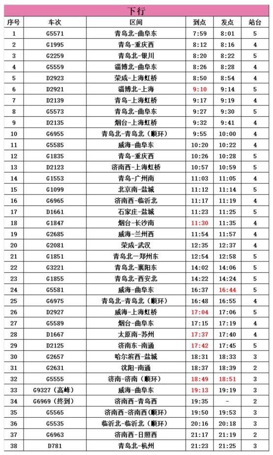 D2124上海虹桥-济南西线路增加青岛西站、胶州北站、潍坊北站、淄博北站、济南东站,取消潍坊站、济南站。