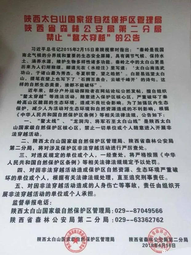 2018年4月16日,陕西太白山国家级自然保护区管理局、陕西省森林公安局第二分局发布禁止“鳌太穿越”的公告。
