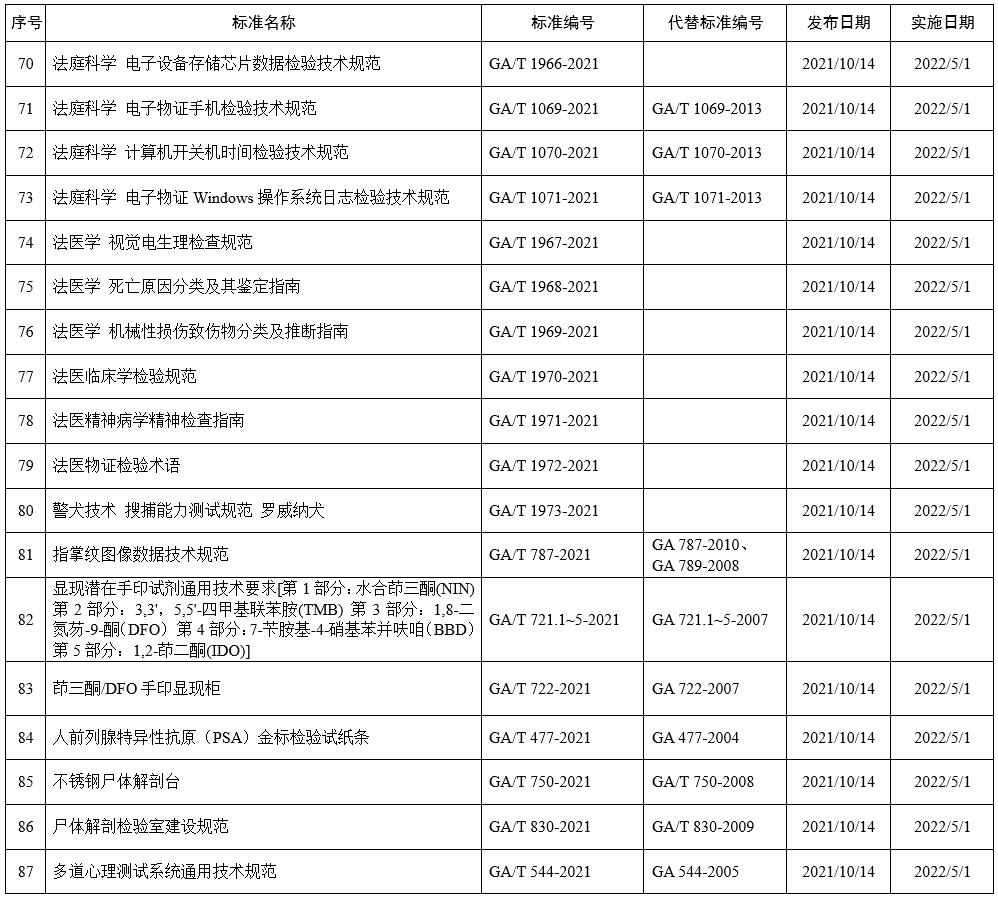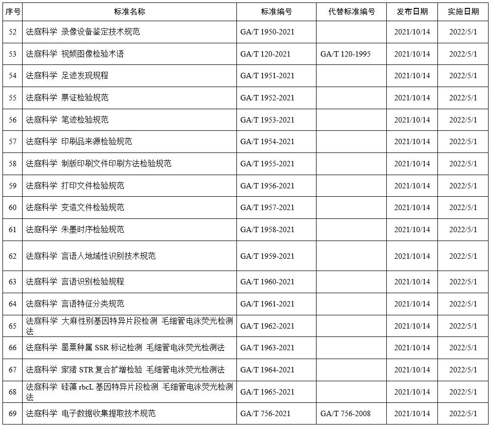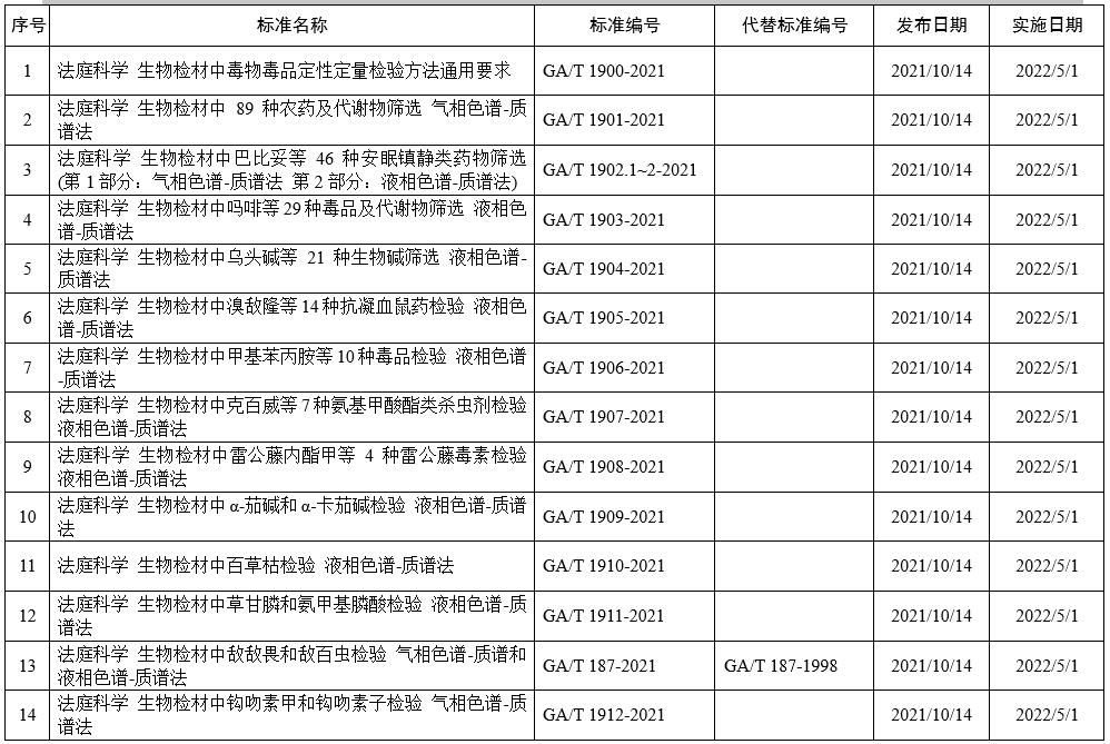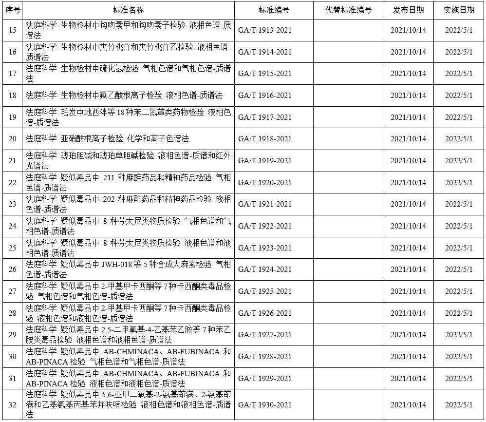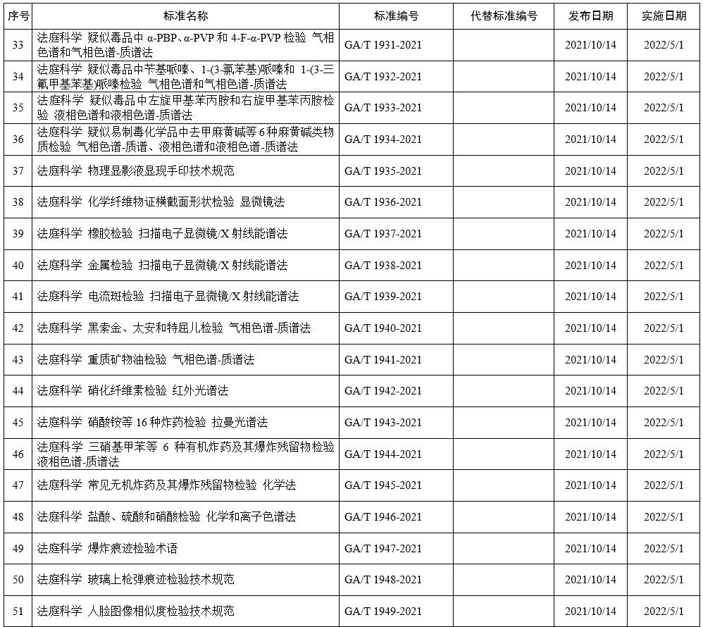 一是为依法打击违法犯罪、护航平安中国构筑坚实的技术基础。本次发布的标准中,属于全国刑事技术标准化技术委员会归口的标准有90项,涉及毒物毒品、微量物证、声像资料、电子物证、法医、DNA、指纹、痕迹、文件检验、警犬技术等专业领域。这些标准的发布,为刑法、刑事诉讼法、禁毒法、治安管理处罚法的实施提供了全方位的技术支持,成为侦查、诉讼、审判过程的科学依据和操作守则。也为织密法治之网,强化法治之力,健全社会公平正义法治保障制度方面提供了基本规范与具体遵循。也必将为改革强警、科技兴警战略实施注入新的能量,在推动公安执法能力、执法质量提升,统筹推动法治国家、法治政府、法治社会建设方面发挥积极作用。