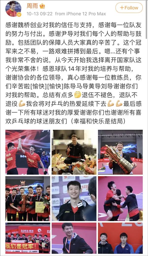 13日一早,前一天跟随山东魏桥拿下乒超冠军的@周雨 在微博发文宣布退出国家队,“感恩球队14年对我的培养与帮助,谢谢协会的各位领导,真心感谢每一位教练员,你们辛苦啦,陈导马导黄导刘导谢谢你们对我的帮助”。