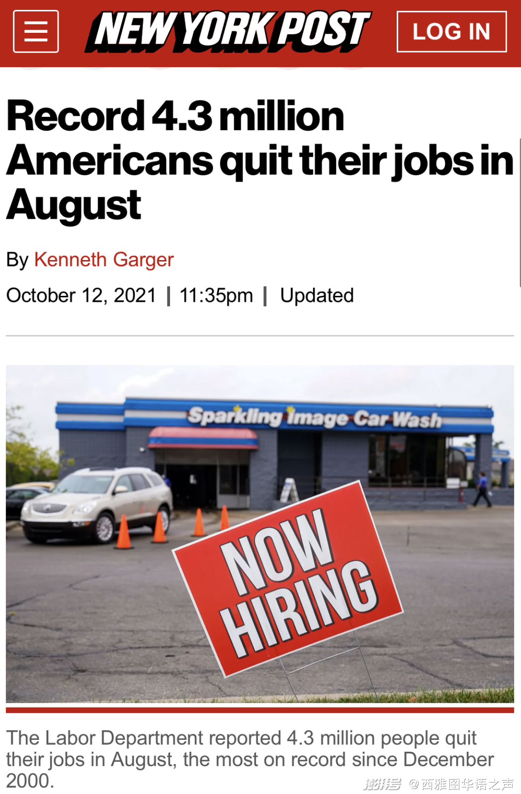 【纽约邮报】据美国劳工部12日公布的数据显示,8月份美国的辞职率创下新高。据统计,美国8月份的总离职人数约为600万人,其中辞职人数为430万,辞职率达到了创纪录的2.9%。