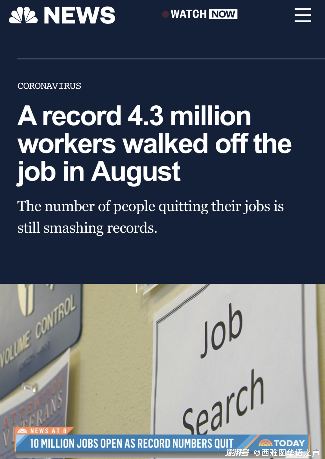 美国劳工部方面表示,辞职人数是2000年12月以来的最高纪录,主要集中在食品服务、住宿、零售业等行业。此外,美国8月份的招聘工作也有所放缓,开放的工作岗位数量从上个月的约1110万下降到后面一个月的1040万。