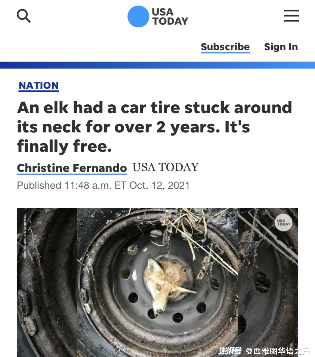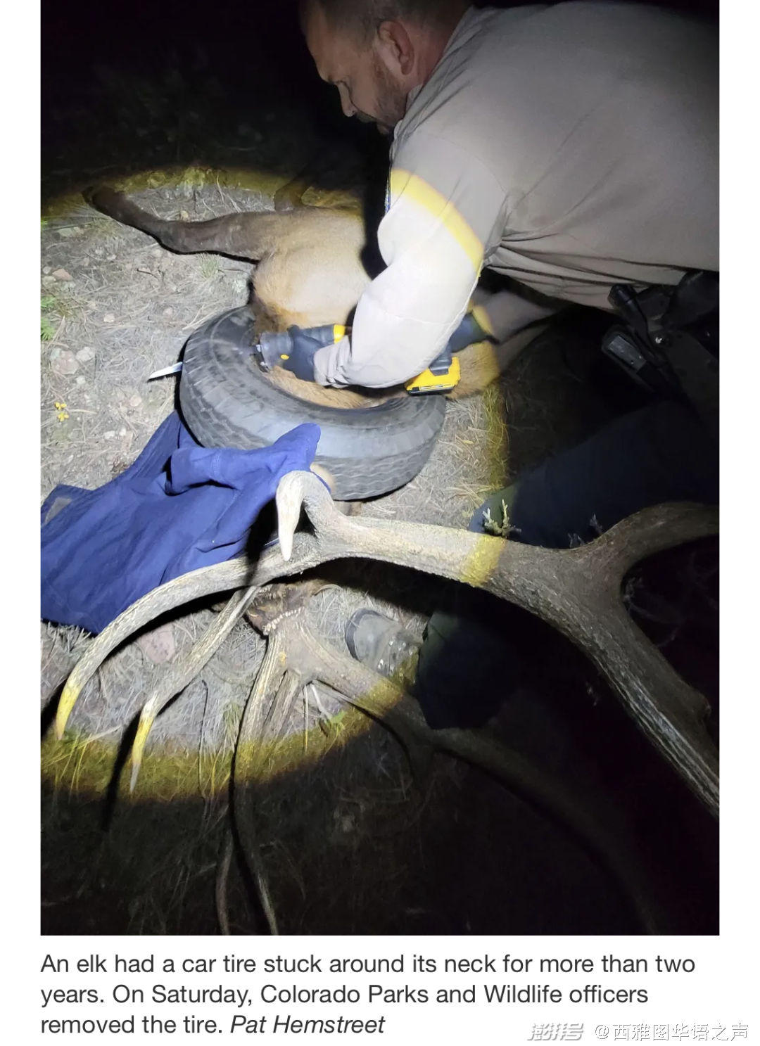 【今日美国】据美国科罗拉多公园及野生动物部门近日发布的新闻稿称,一头脖子上悬挂汽车轮胎的野生公麋鹿时隔两年后终于被野生动物管理人员找到,管理人员帮它取下了轮胎。目前,这只鹿当初如何套上轮胎还不清楚。