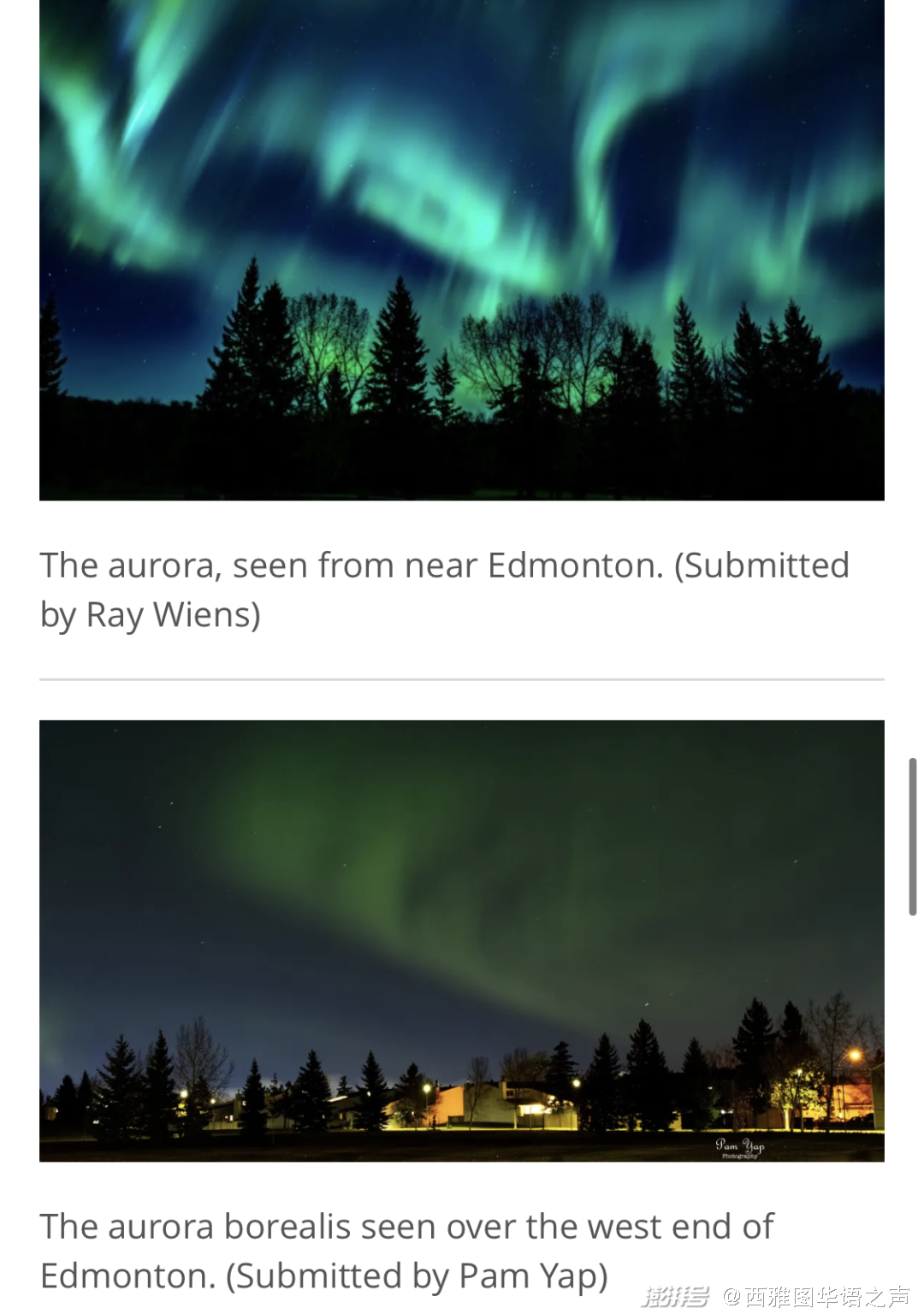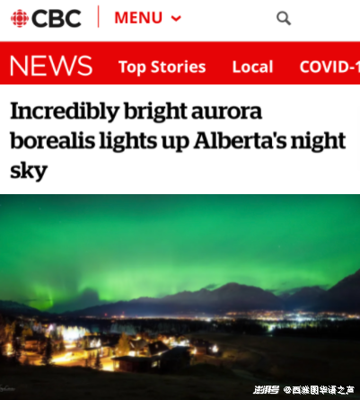 【CBC】加拿大艾伯塔省天空昨日出现绝美极光,天空被明亮的绿色极光点亮。据报道,极光景象对于加拿大来说并不常见,多出现在极地地区。