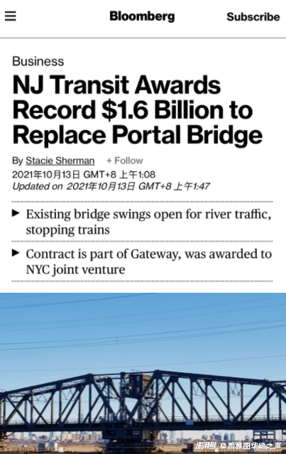 【彭博社】美国新州捷运公司(NJ Transit)周二宣布,新州已签下一份15.6亿美元的合同,建设通往纽约的新铁路桥——门户北桥(Portal North Bridge)。这是新州捷运公司历史上最大一份合同,也是拖延多年后的一个具有重大里程碑意义的事件。