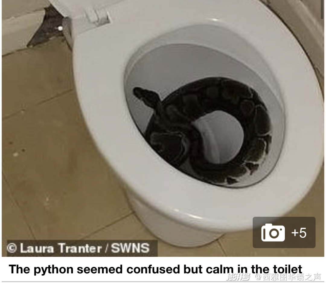 【每日邮报】一名英国女子劳拉·特兰特近日起床后去上厕所时目睹噩梦般的一幕:马桶里钻出一条巨大的蛇。特兰特拍摄的视频显示,这条约有4英尺长的大蛇盘绕在马桶里,就像一个“管道工”。