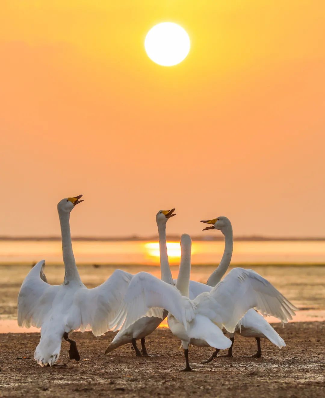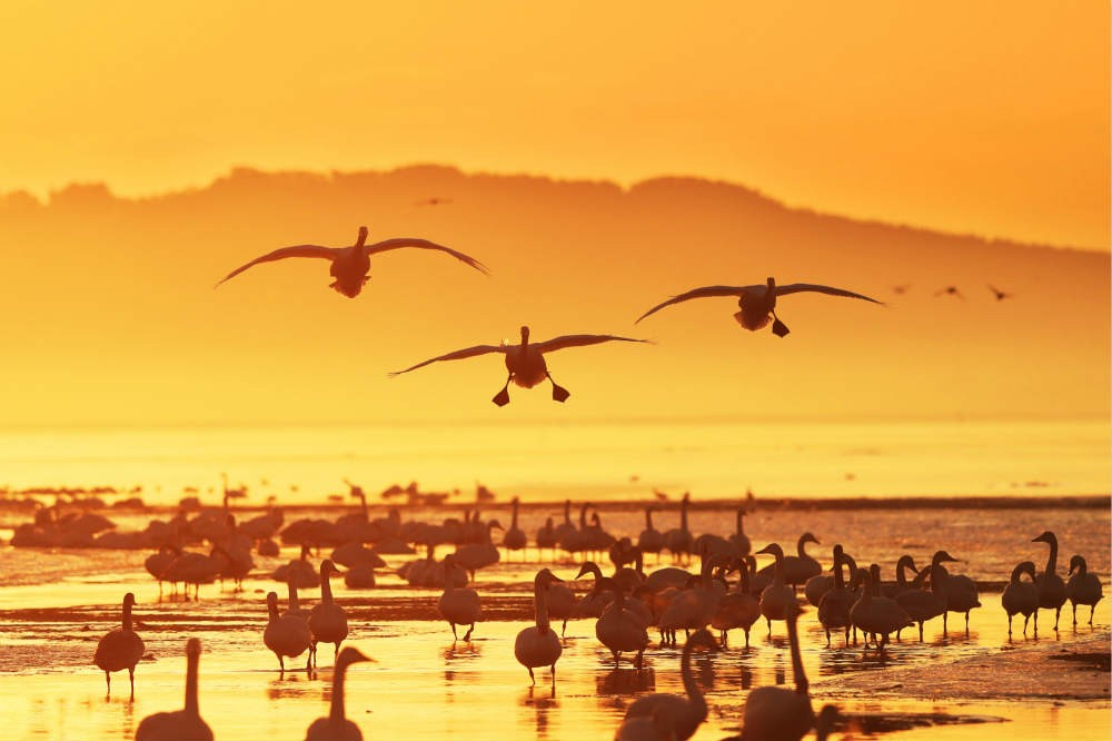 荣成作为大天鹅的最佳越冬栖息地,每年自10月中下旬开始,上万只大天鹅从西伯利亚、蒙古飞行2000—4000公里来到荣成,主要栖息在俚岛镇烟墩角海湾、好运角旅游度假区天鹅湖海面,以及荣成沿海、湿地、河道等地,觅食、游玩、亲昵、飞翔。随着近期天气转冷,将会有越来越多的大天鹅飞抵这里,场面十分壮观,那洁白的天使或追逐戏水,或引吭高歌,或凌空翱翔,使人如醉如痴,流连忘返……