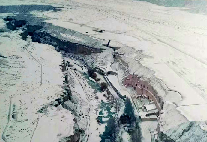 斯文·赫定于1934年11月5日拍摄的尚未竣工的莫高窟九层楼,这张照片很有可能是九层楼的第一张照片